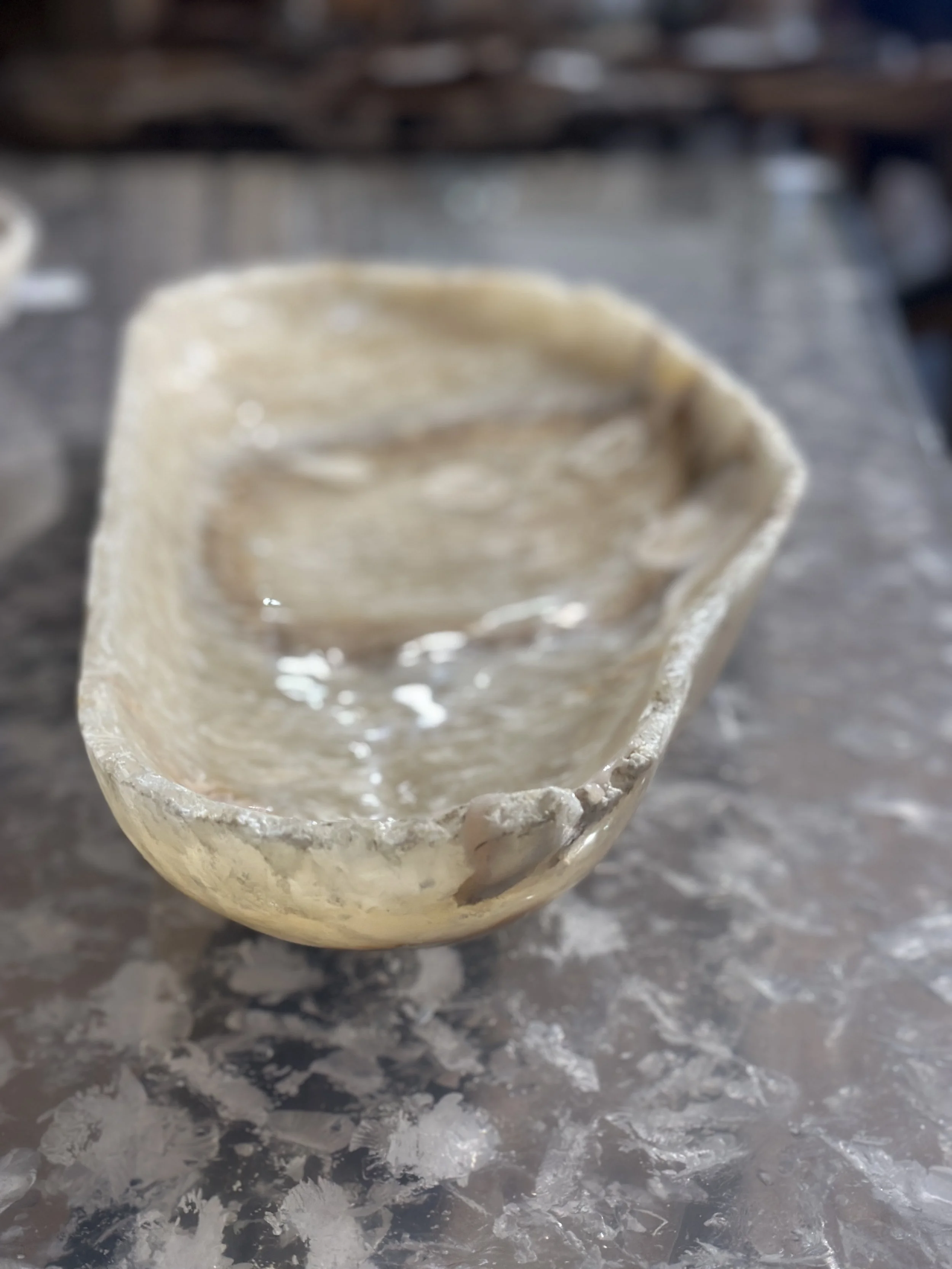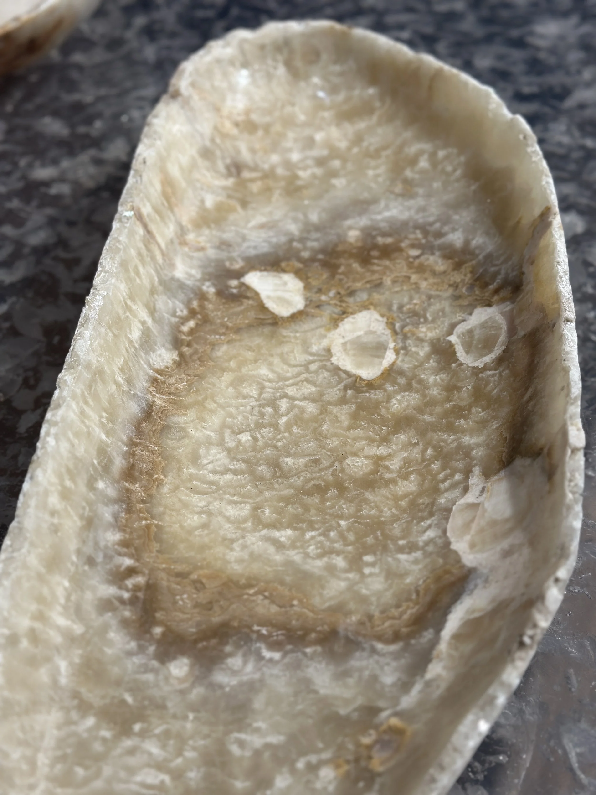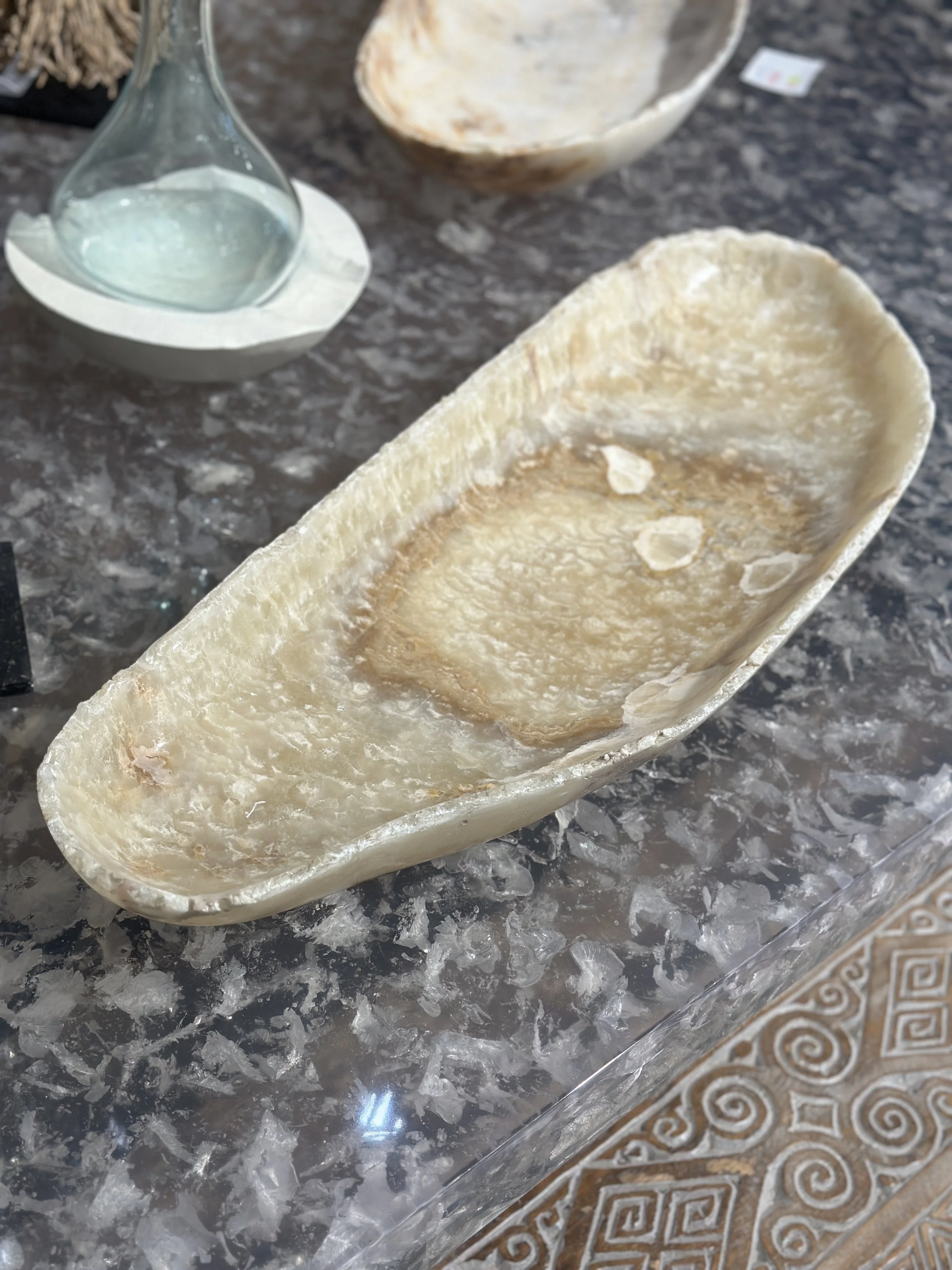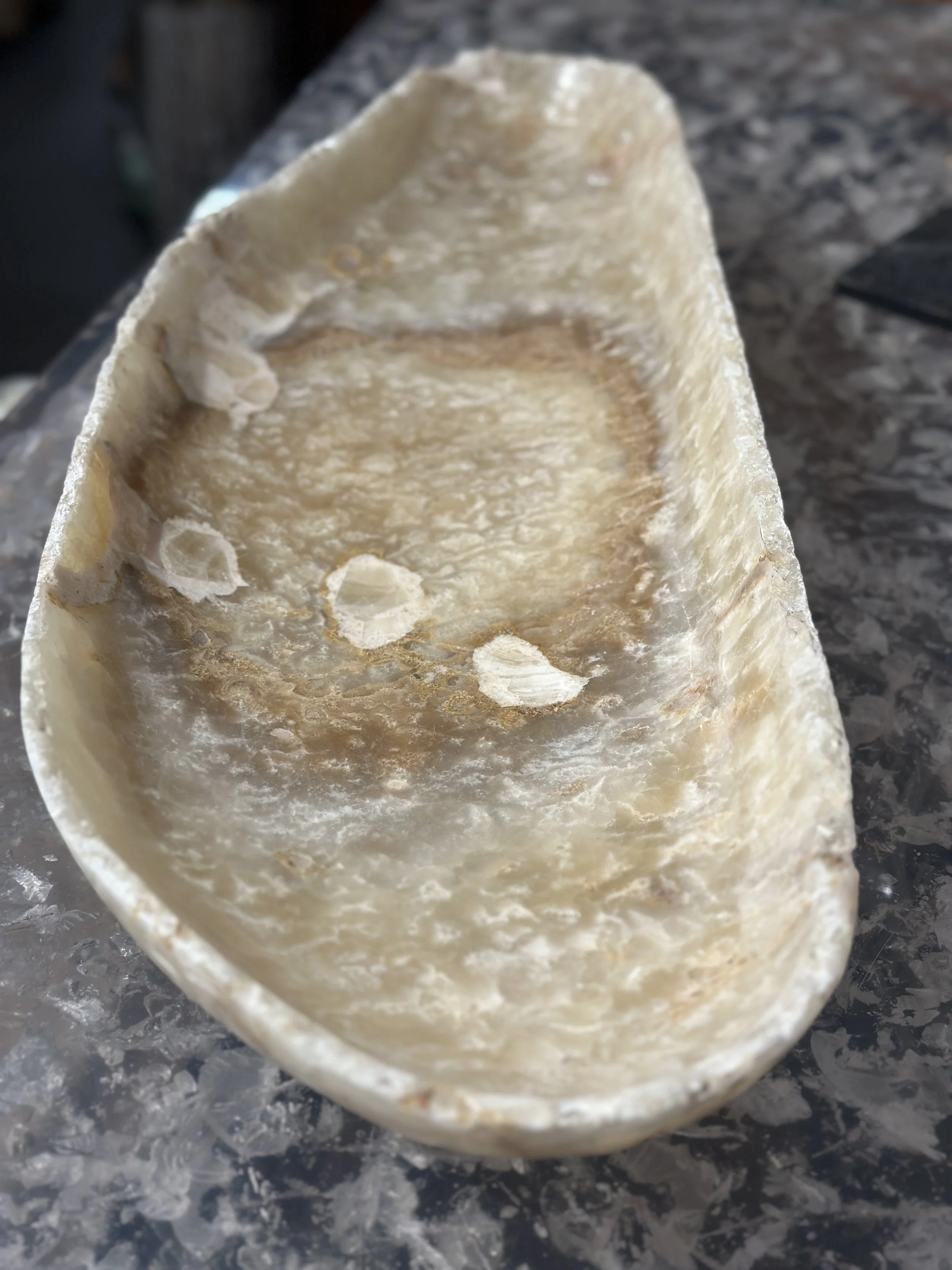 Hand carved long Onyx bowl. Natural and tan color with waves of cream veining. The his bowl measures 29” long and is a max width of 10.5”