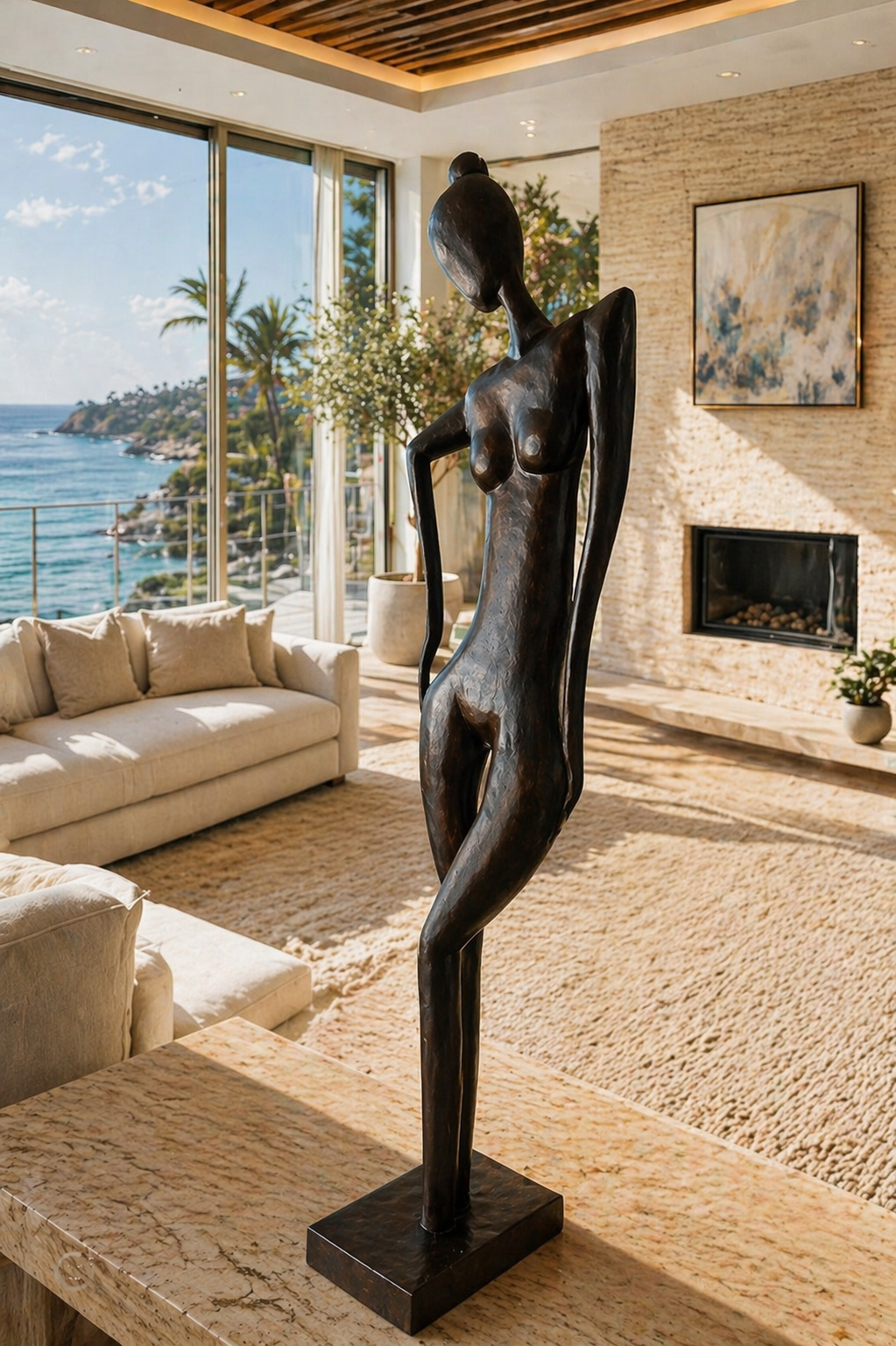 This modern sculpture of a woman’s form is sure to complete the look your room has been waiting for. Standing 9’ tall this sculpture will fill the space it’s in. Representing a balance of strength and femininity She’s sure to gain the admiration of all who come to see her.